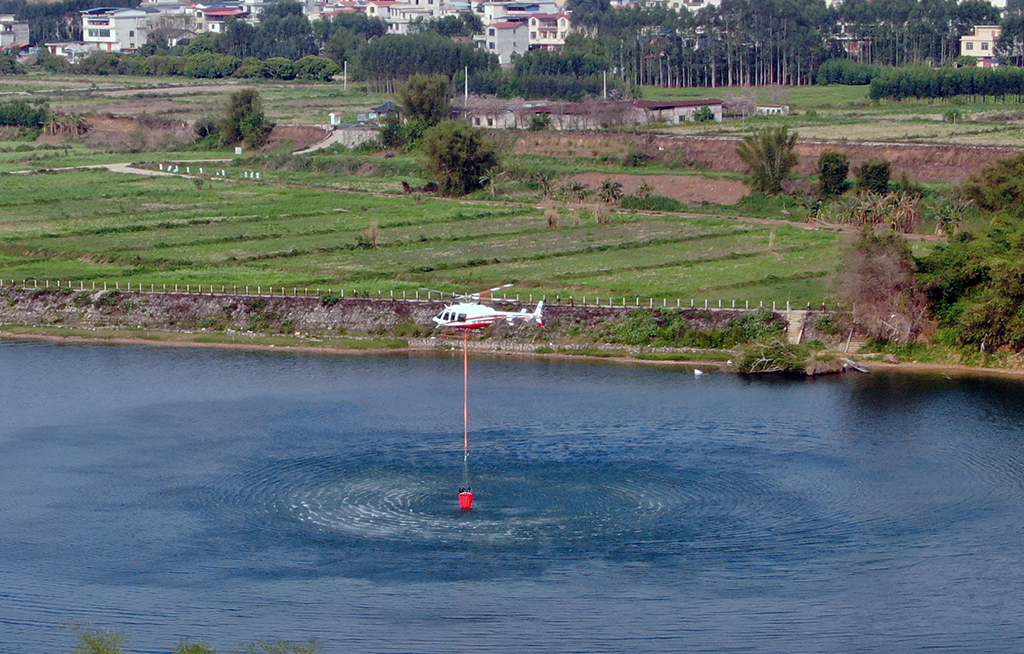 ▲直升機(jī)消防取水演練