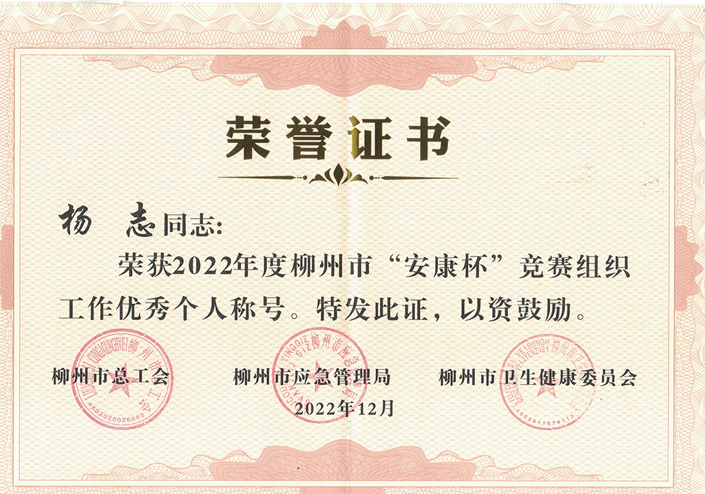 3月7日,在柳東新區(qū)(高新區(qū))總工會2022年工作表彰會上,科虹公司榮獲由柳州市總工會、柳州市應急管理部、柳州市國家衛(wèi)生健康委員會聯(lián)合頒發(fā)的2022年度柳州市“安康杯”競賽優(yōu)勝單位稱號,楊志同志榮獲競賽組織工作優(yōu)秀個人稱號。