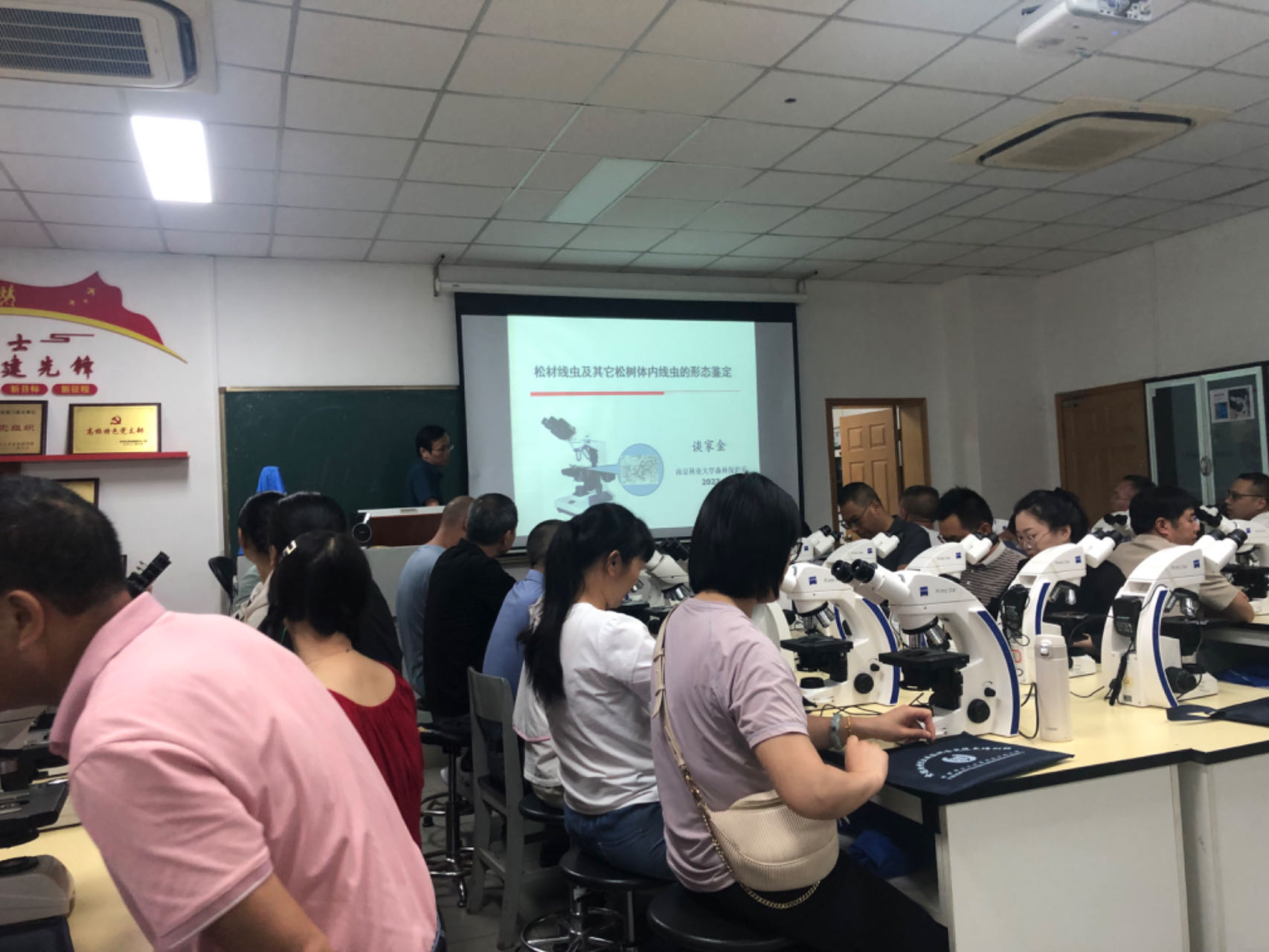 本次培訓(xùn)班是為大力提升自治區(qū)基層監(jiān)測普查、疫情識別、檢測檢驗與鑒定水平,確保疫情能被及時發(fā)現(xiàn)和除治,包含理論授課環(huán)節(jié)、室內(nèi)實驗環(huán)節(jié)和野外病害調(diào)查診斷環(huán)節(jié)。理論授課環(huán)節(jié),員工了解了國內(nèi)外松材線蟲病發(fā)生與防治技術(shù)研究進(jìn)展,學(xué)習(xí)了松材線蟲取樣與分離、松材線蟲形態(tài)鑒定、松材線蟲病野外監(jiān)測、線蟲分子檢測鑒定等技術(shù)。室內(nèi)實驗環(huán)節(jié),員工親自動手采樣、分離疫木中的線蟲,實操松材線蟲形態(tài)鑒定、松樹體內(nèi)幾種寄生線蟲的形態(tài)比較、病死松樹體內(nèi)松材線蟲的鑒定、松材線蟲自動化分子檢測等實驗。野外病害調(diào)查診斷環(huán)節(jié),員工到句容林場調(diào)查松材線蟲病發(fā)生情況,實地學(xué)習(xí)松樹樹干打孔注射技術(shù)。