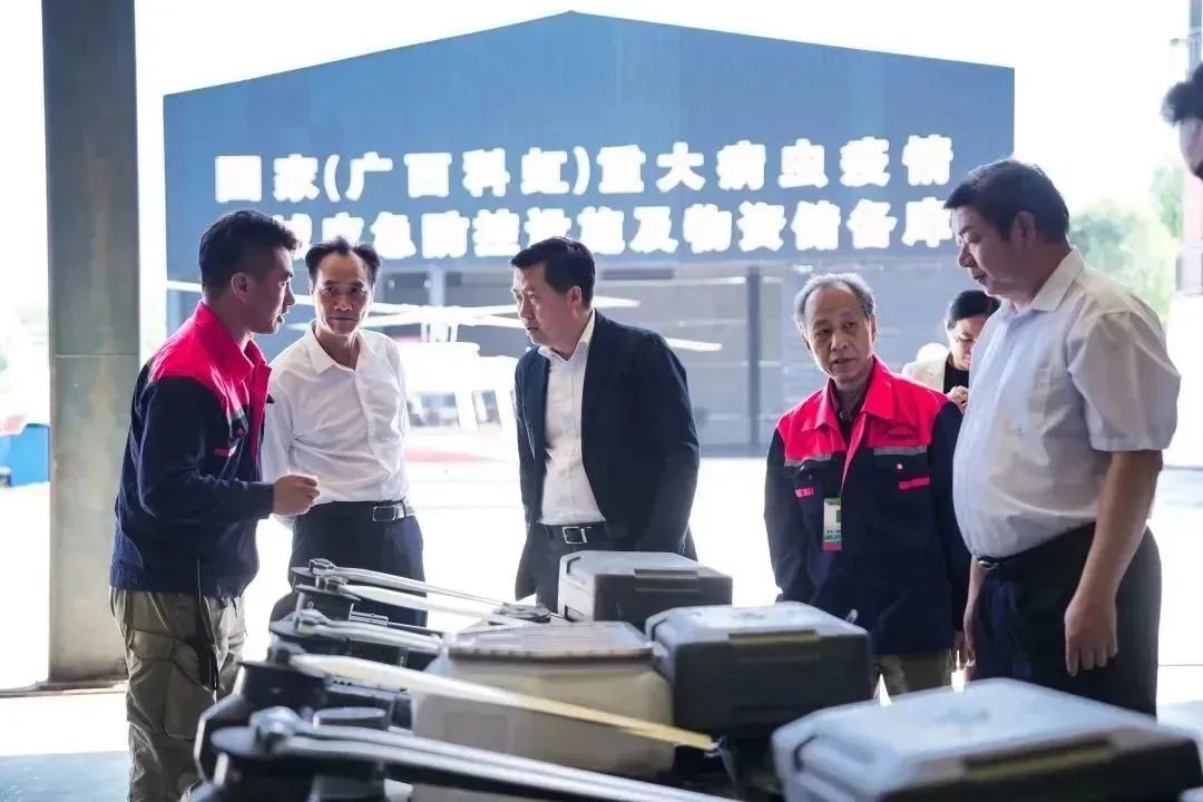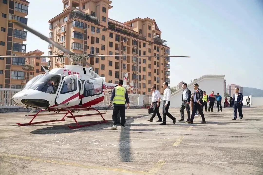 各位領(lǐng)導(dǎo)、專家、嘉賓乘坐科虹公司直升機(jī)前往國家(廣西科虹)重大病蟲疫情區(qū)域應(yīng)急防控設(shè)施及物資儲備庫參觀。