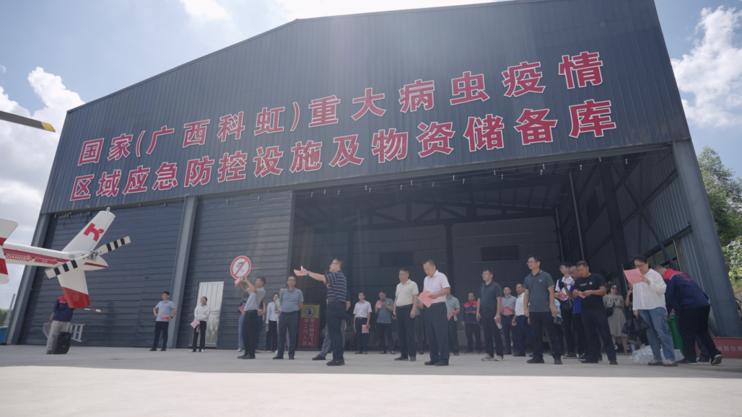 在科虹公司應(yīng)急儲備庫,總經(jīng)理肖志科向與會代表詳細介紹了應(yīng)急儲備庫的建設(shè)背景、功能定位、投資規(guī)模、防控設(shè)施、物資儲備以及當前運行情況。肖志科總經(jīng)理表示,應(yīng)急儲備庫是國家藏糧于地藏糧于技專項——動植物保護提升工程重點項目,由廣西壯族自治區(qū)植保站、科虹公司共同建設(shè)。項目建設(shè)藥械、農(nóng)藥運輸工具等物資儲備庫面積2227.06㎡,購置大型載人農(nóng)用施藥直升機等大中型防治設(shè)備及轉(zhuǎn)運運輸、遠程指揮調(diào)度和維修設(shè)備等48臺(套)。項目建成后可直接服務(wù)于地方農(nóng)業(yè)生產(chǎn),提高防治效果、效率,減少農(nóng)藥使用量、降低防治成本。本項目加上科虹公司原有的防治能力,整體可形成25萬次畝以上的日防治能力 ,全年專業(yè)防治化面積可達3000 萬畝次以上。
