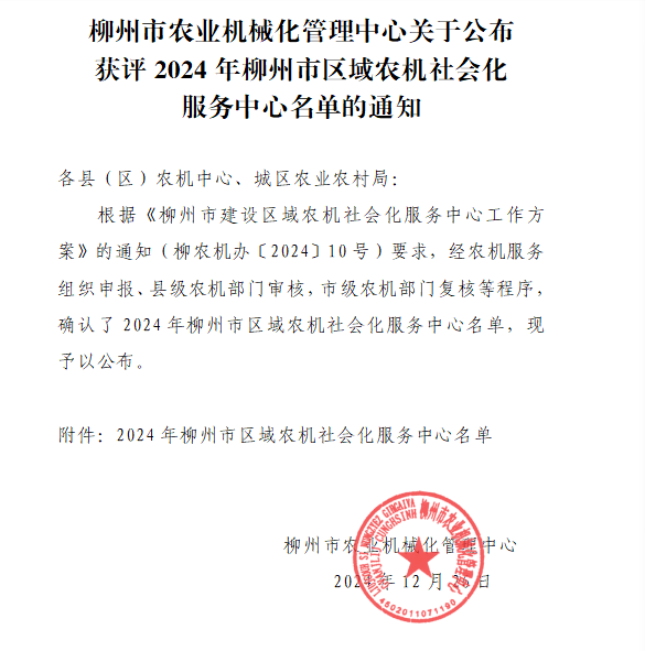 公司獲評首批柳州市區(qū)域農機社會化服務中心