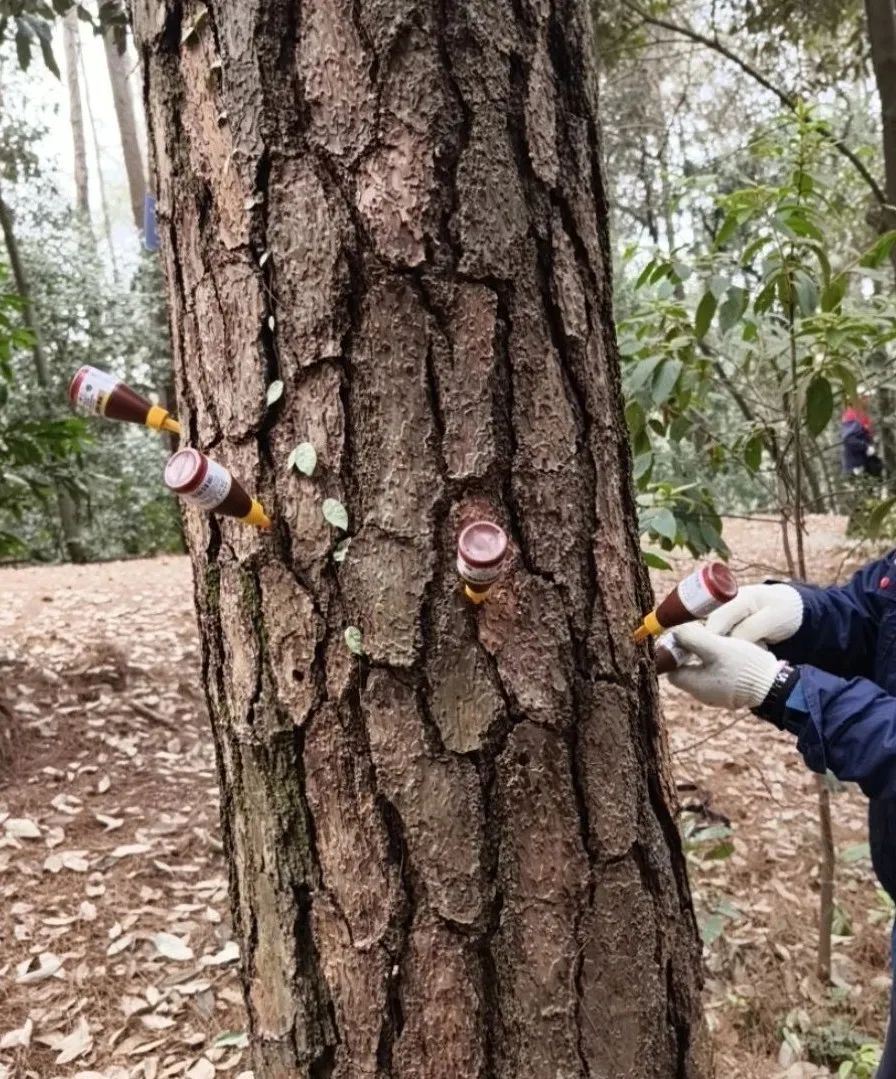 人勤春來早,“護(hù)綠”正當(dāng)時。近日,廣西科虹公司優(yōu)質(zhì)高效完成某公園松樹注干施藥工作。松樹注干施藥是一種有效防治松材線蟲的方法之一,通過向松樹樹干鉆孔注入藥劑,利用樹木自身的蒸騰作用,將藥液輸送至全株,從而高效、精準(zhǔn)滅殺松材線蟲及其媒介昆蟲松墨天牛,還能有效減少農(nóng)藥殘留,避免對生態(tài)環(huán)境造成破壞。