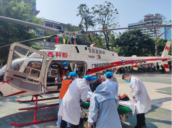 9時30分,直升機準時降落在玉林市第一人民醫(yī)院的停機坪,待醫(yī)院交接手續(xù)完成,螺旋槳再次轟鳴,直升機載著生命的希望騰空而起飛往南寧。