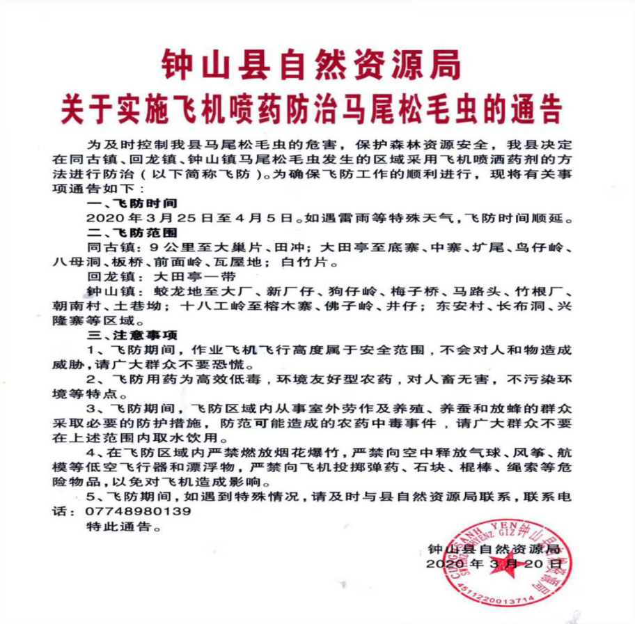 為有效開(kāi)展防治工作,及時(shí)控制馬尾松毛蟲(chóng)的危害,保護(hù)森林資源,提升林業(yè)有害生物防控的效率和防治效果,降低治理成本。鐘山縣有關(guān)部門(mén)決定委托廣西科虹有害生物防治股份有限公司,采用直升飛機(jī)對(duì)馬尾松毛蟲(chóng)進(jìn)行施藥防治。