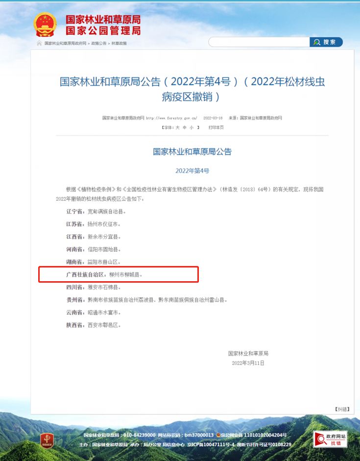 3月18日,國家林業(yè)和草原局發(fā)布(2022年第4號(hào))(2022年松材線蟲病疫區(qū)撤銷)的公告,撤銷了柳州市柳城縣的松材線蟲病疫區(qū)。這標(biāo)志科虹公司以優(yōu)異的成績完成了柳城縣疫區(qū)防治任務(wù),給業(yè)主交上了一份滿意的答卷!1000余天的艱苦奮斗,1000余天的辛勤付出,在這一刻,科虹人所有的努力與付出都得到了最好的回報(bào)與認(rèn)可。同時(shí),這也是對(duì)科虹公司精益求精的服務(wù)態(tài)度最好的肯定。